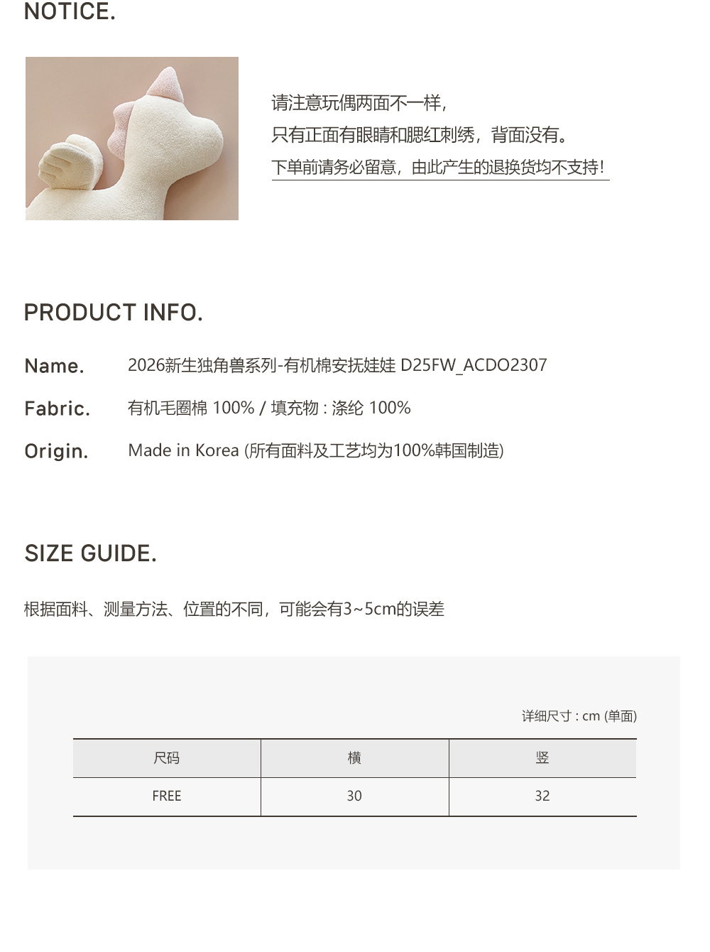 2026年新生獨角獸系列-有機棉安撫娃娃