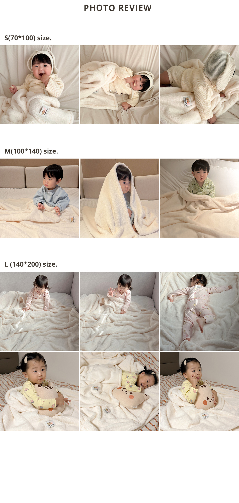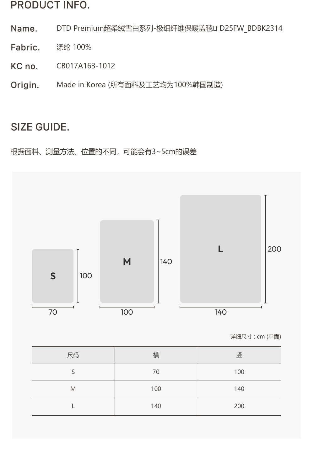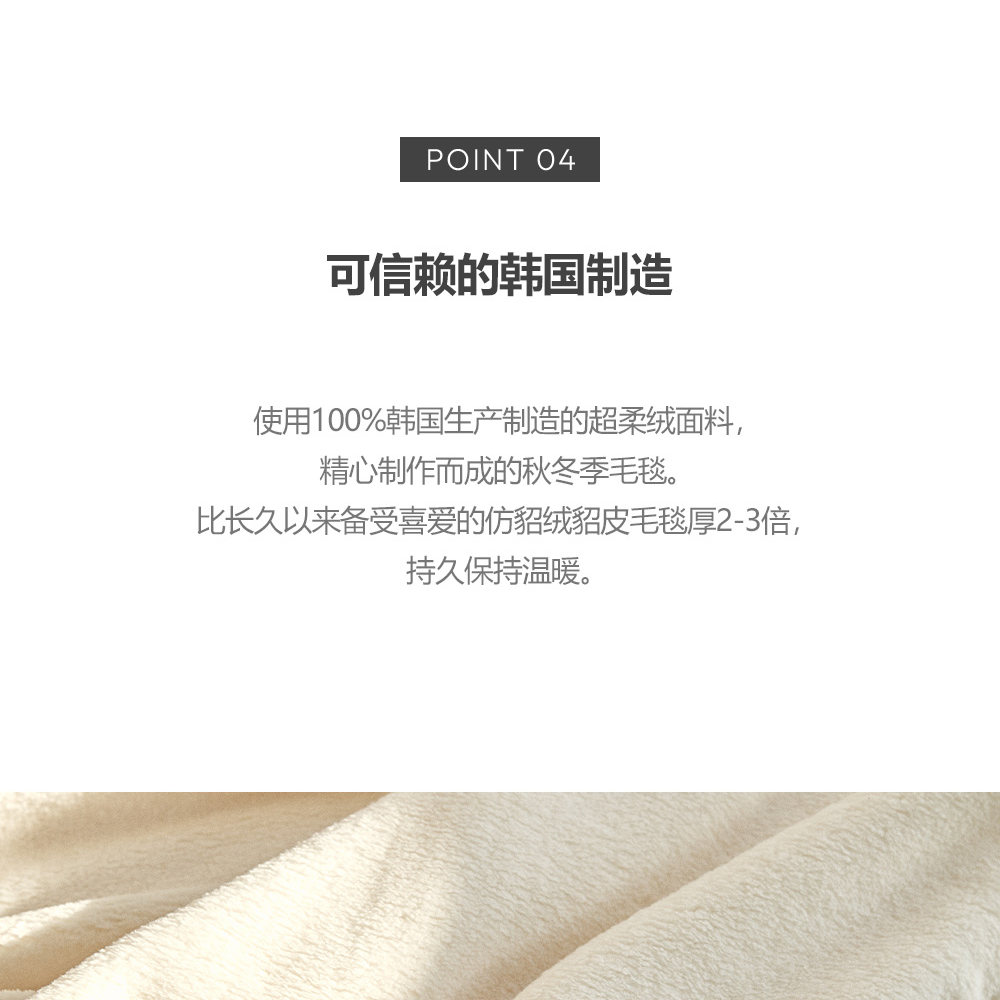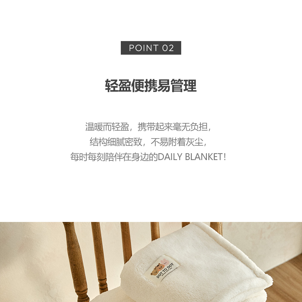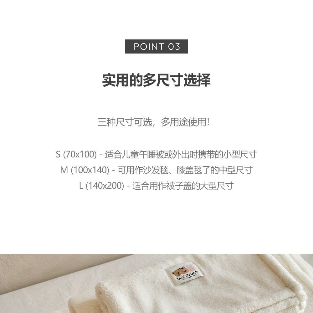 超舒適柔軟觸感 高級超柔絨面料深而柔軟, 輕輕一蹭,溫暖瞬間傳達到指尖。 極其細密的纖維觸碰肌膚時, 帶來光滑無刺激,愉悅溫暖的感覺。 輕盈便攜易管理 溫暖輕盈,攜帶起來毫無負擔, 結構 細緻密致,不易附著灰塵, 每時 每刻陪伴在身邊的DAILY BLANKET! 實用的多尺寸選擇 三種尺寸可選,多用途使用! S (70x100)-適合兒童午睡或外出時攜帶的小型尺寸 M (100x140)-可用作沙發毯、膝蓋毯子的中尺寸 L(140x200)-適合用作被子蓋的大型尺寸 可信賴的韓國製造 使用100%韓國生產製造的超柔絨布料, 精心製作而成的秋冬季毛毯。 比長久以來備受喜愛的仿貂絨貂毛毯厚2-3倍, 持久保持溫暖。